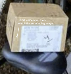 • In the first image below, at extreme magnification you can see a faint mosaic pattern of squares, which is called a JPEG artifact. The artifact pattern on the parcel exactly matches those on the bicycle seat and surrounding area.