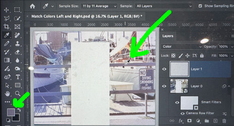 You use the Eye Dropper tool (shown by the right green arrow) to select a good color you want to paint over on the left side. In this case, I was sampling the wood color of the upper rail of the fence. Note that it is already sampled as the foreground color chip now shows the color of that fence board (left green arrow)