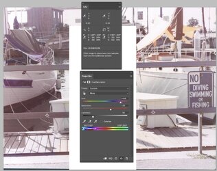 • On the right side of the image, it seems likely that the "No Diving" sign should have white text. But if you hover over the white areas of that sign using the Info panel, the RGB values are not identical and are particularly deficient in the blue channel.