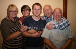 I wanted to get him a wallet card with a picture of him on but can't find any pictures of just the two of them together. Is there any way that anyone could possibly make this so that it's just the ginger guy in the middle and the man on the end on the right? Changing backgrounds etc would be absolutely fine, anything to get it to happen would be great. If that's too hard, the man inbetween them can stay in it.