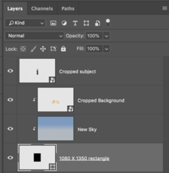 I then placed the new sky layer between the 1080 x 1350 rectangle layer and the Cropped background layer and added a clipping mask.